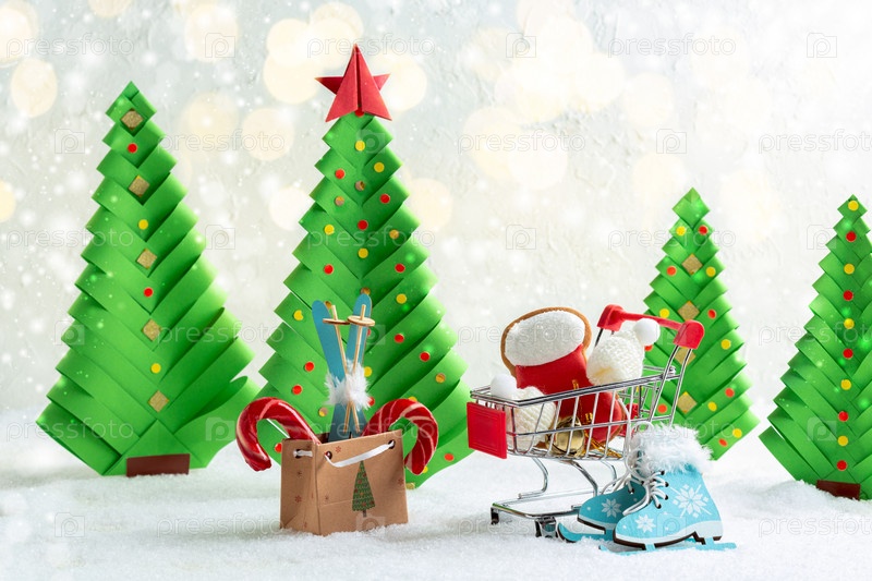 Рождественская открытка с елками и игрушками