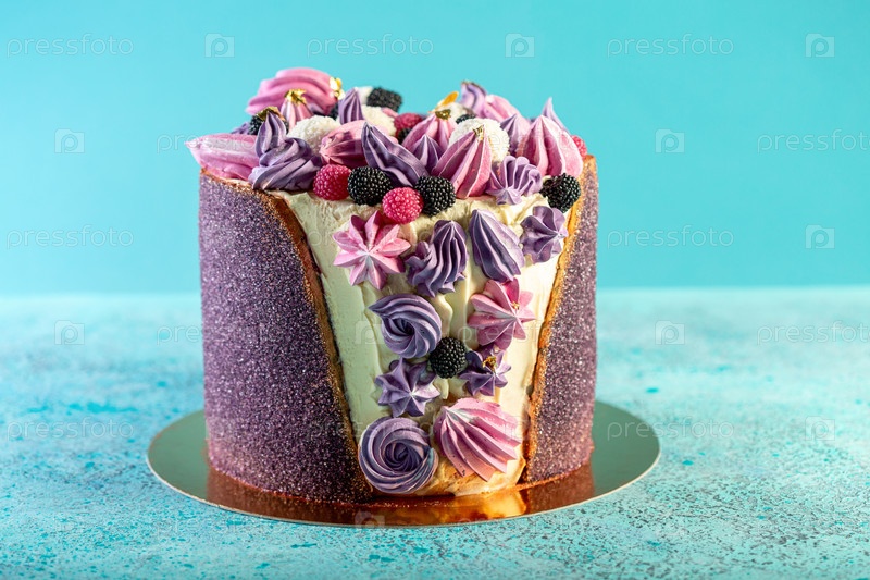 Именниный торт с сиреневыми и розовыми меренгами и мармеладными ягодами