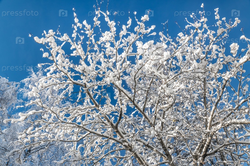Деревья покрыты белым снегом на фоне голубого неба. Зимний пейзаж. Снежный фон