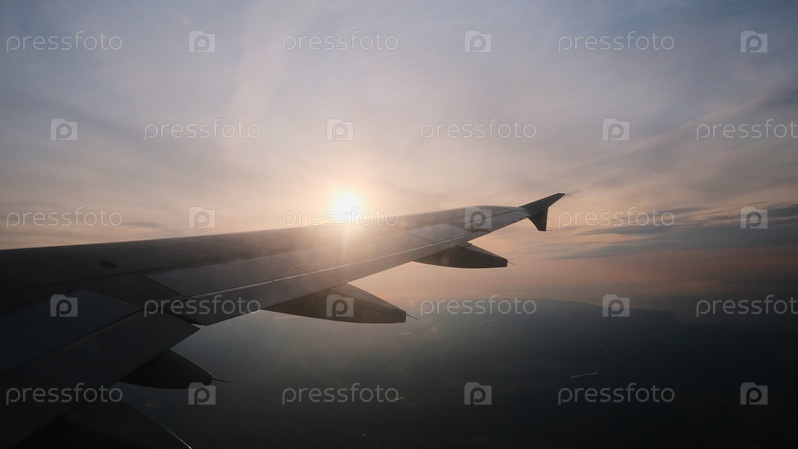Вид из иллюминатора на крыло самолета в полете. Солнце и облака над крылом самолета на высоте
