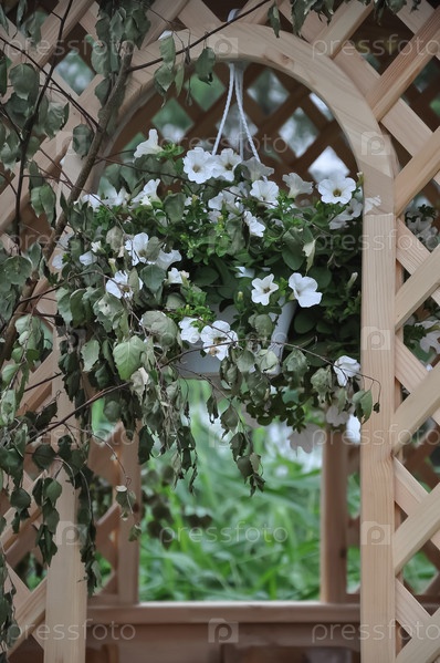 Деревянная арка с цветами. Цветы в парке. Красивая арка из дерева. Украшение сада. Летний сад. Белые цветы в парке. Цветочный горшок. Летний сад. Вид на зеленый сад