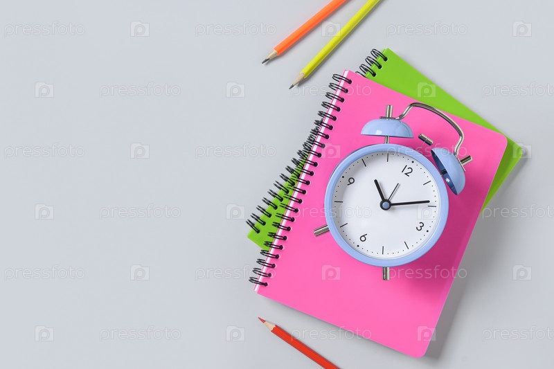 Красочные школьные принадлежности и будильник на синем фоне. Вид сверху, плоская планировка