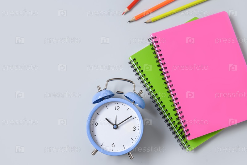 Красочные школьные принадлежности и будильник на синем фоне. Вид сверху, плоская планировка