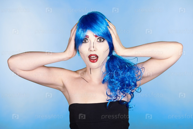 Портрет молодой женщины в стиле комического поп-арта. Потрясенная женщина в синем парике на синем фоне