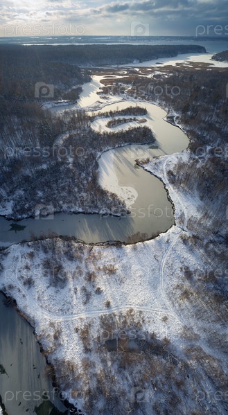 Аэрофото-панорама реки Коэн подо льдом и снегом. Красивый зимний пейзаж
