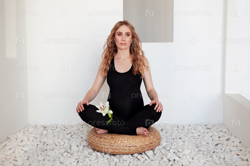 Красивая спортивная беременная женщина сидит на полу в позе лотоса, медитирует или делает упражнения пилатеса в спа. Йога, фитнес