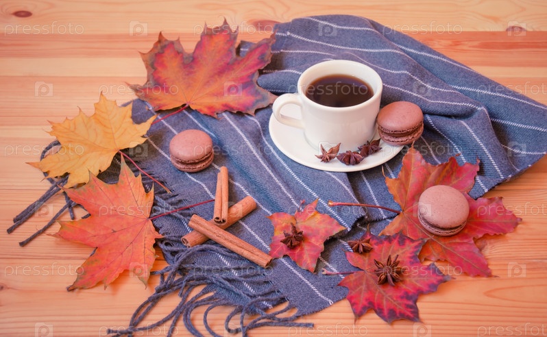 Кофе, шарф, шоколадные миндальные печенья, специи и осенние листья на дереве. Выборочный фокус