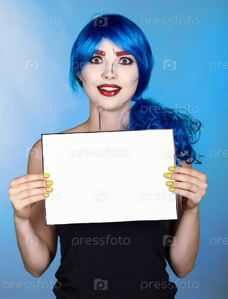 Портрет молодой женщины в стиле комического поп-арта. Женщина с бумагой в руках