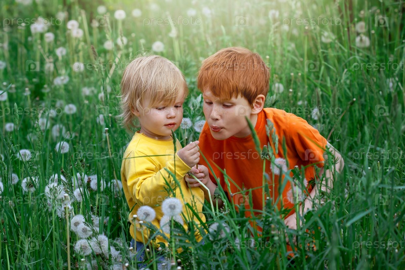 Двое детей, рыжеволосые мальчики и маленькая блондинка, летом дуют на цветы одуванчика на природе