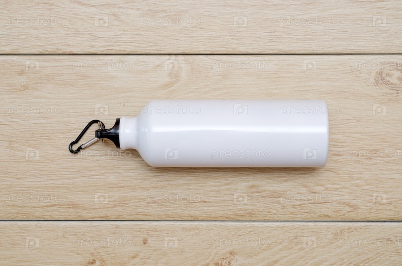 Белая спортивная металлическая бутылка с водой на деревянном фоне