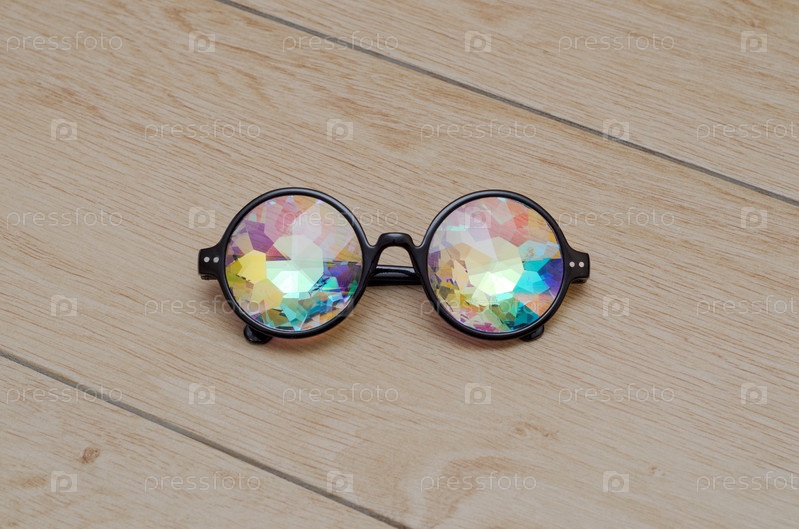 Дизайнерские очки с линзами калейдоскопа на деревянном фоне