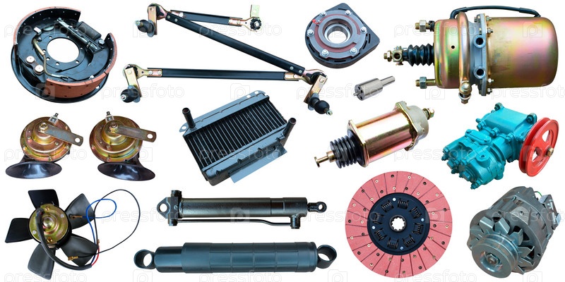 Автомобиль автозапчастей на белом фоне. Набор со многими отдельными предметами для магазина или вторичного рынка