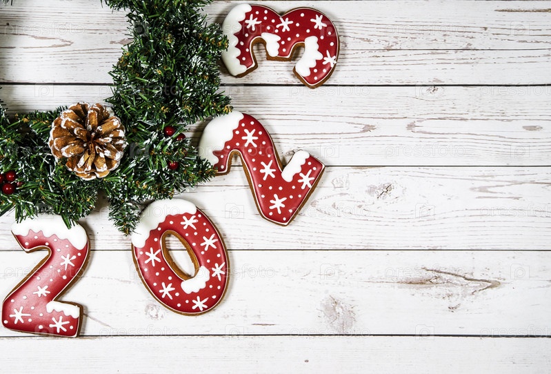 Рождественская картинка с венком из еловых веток и шишек. Пряничная надпись 2023