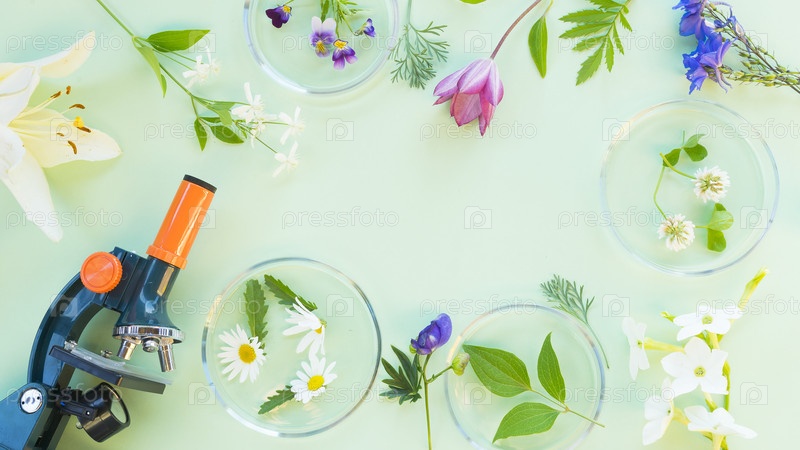 Различные цветы и листья растений в чашках Петри и микроскоп