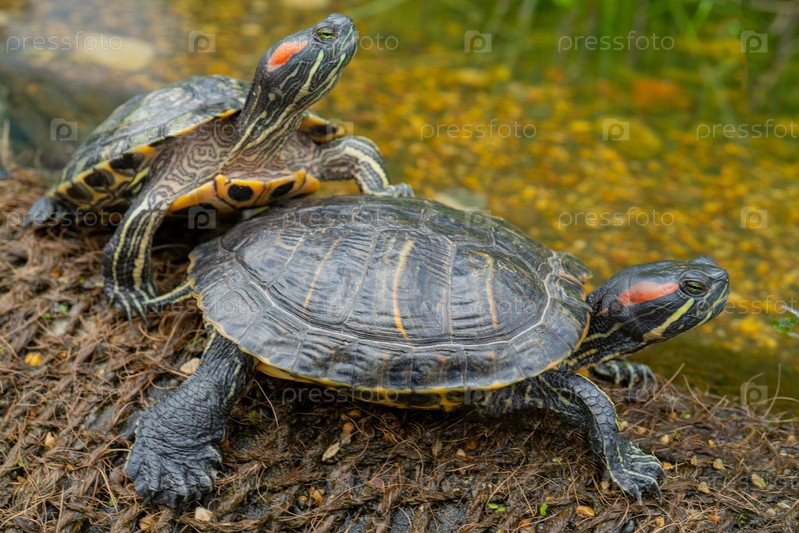 Пресноводные черепахи на берегу у воды