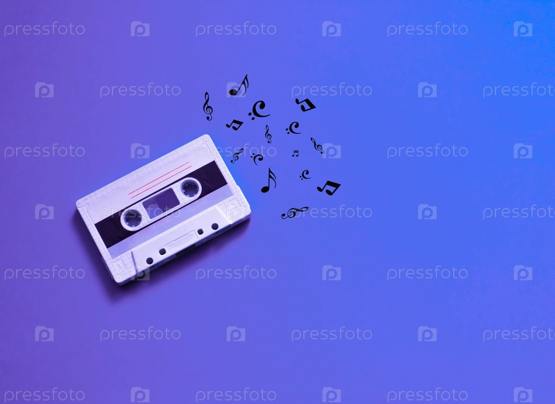 Аудио кассета. Винтажная белая аудиокассета на цветном фоне с нотами. стиль 80-х. ретро концепция