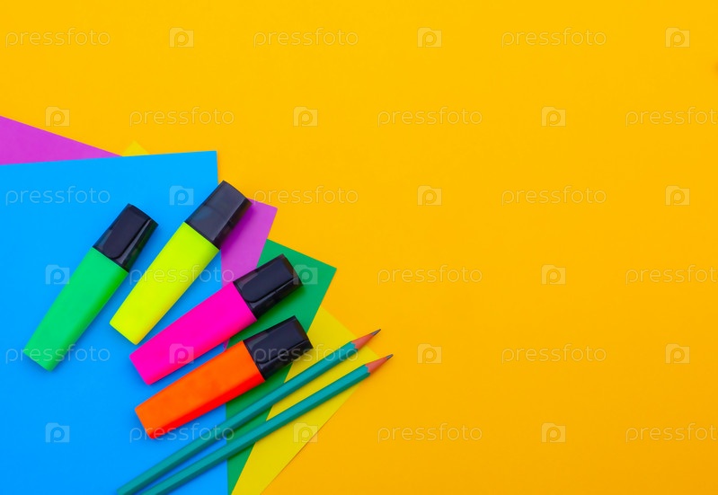 Вид сверху на канцелярские принадлежности с цветной бумагой и разноцветными маркерами. Рабочее место с копией пространства крупным планом