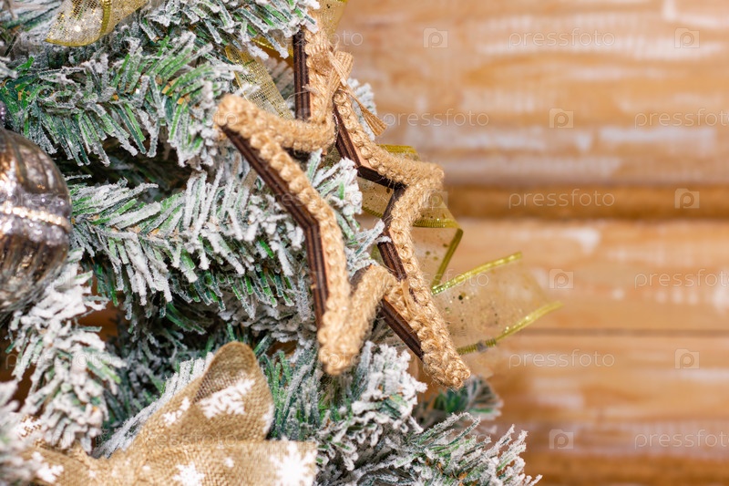 Заснеженная елка на деревянном фоне с игрушками, звездой. Концепция зимней открытки. мягкий фокус