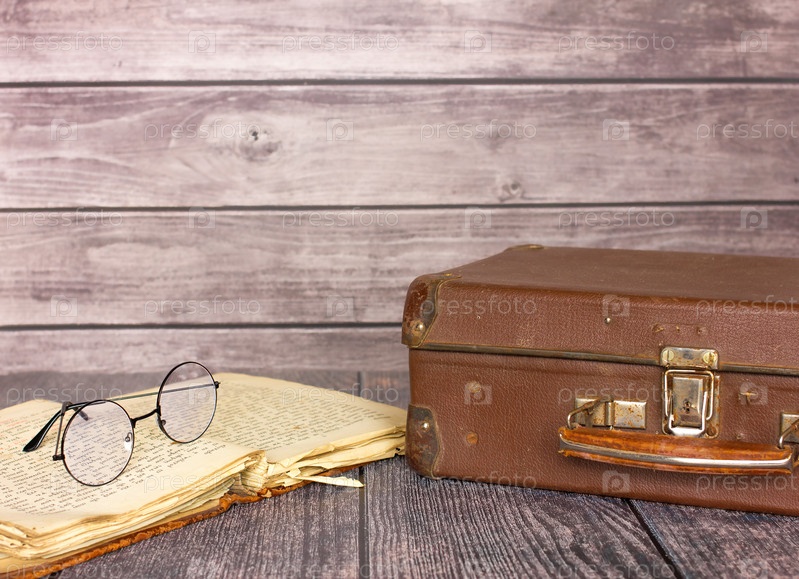 Винтажная старая открытая книга с чемоданом для очков на деревянном фоне. концепция изучения истории. Коричневый деревянный фон. копировать пространство
