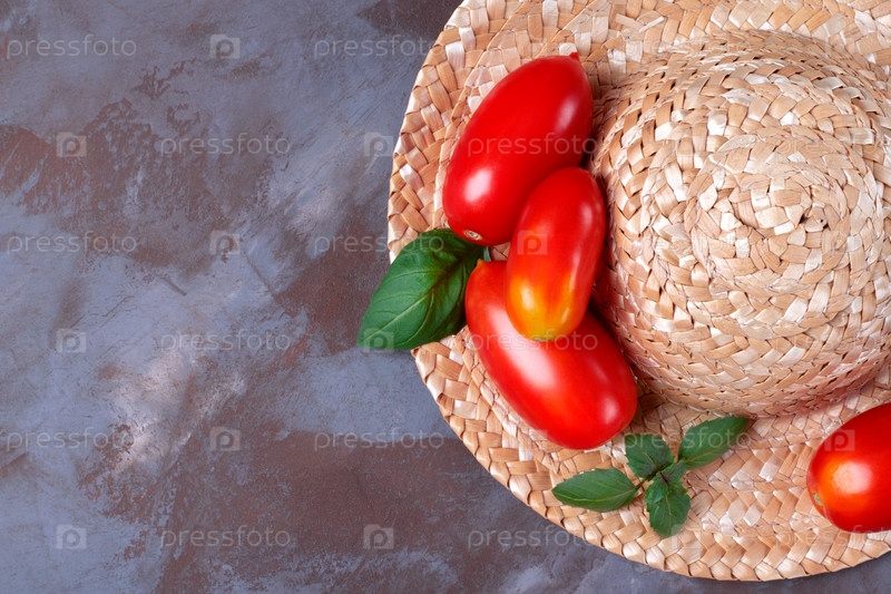 Спелый помидор сливы на соломенной шляпе на сером столе. Органические сельскохозяйственные овощи