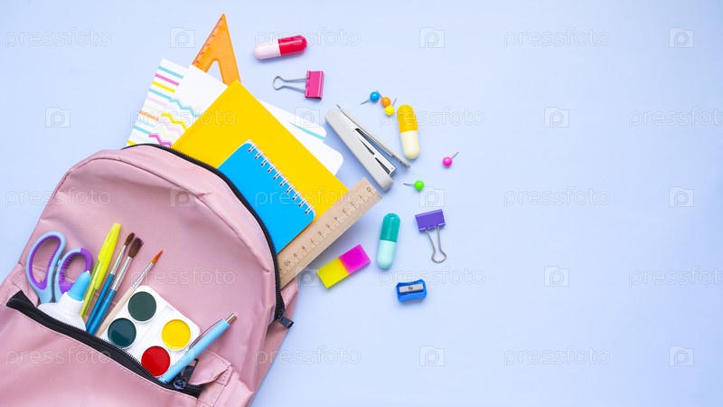 Рюкзак с торчащими из него канцелярскими принадлежностями на зеленом фоне