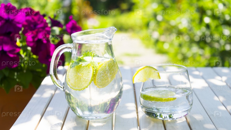 Кувшин лимонада и стакан на столе в саду