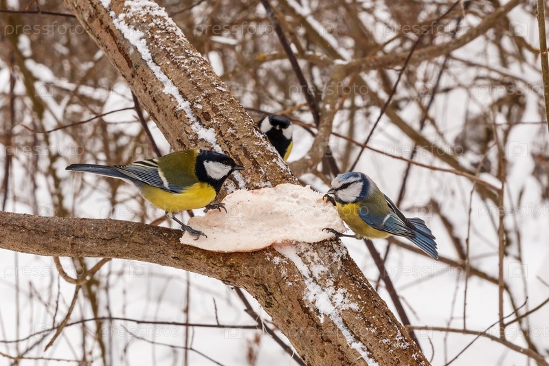Большая синица и лазоревка клюют сало на ветке дерева в лесу. Кормушка для птиц зимой
