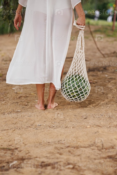 Девушка с арбузом на пляже с песком
