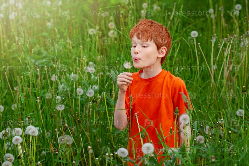 Рыжий мальчик дует на одуванчик в высокой траве в теплый солнечный день
