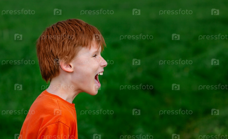 Портрет кричащего рыжеволосого мальчика на фоне зеленой травы