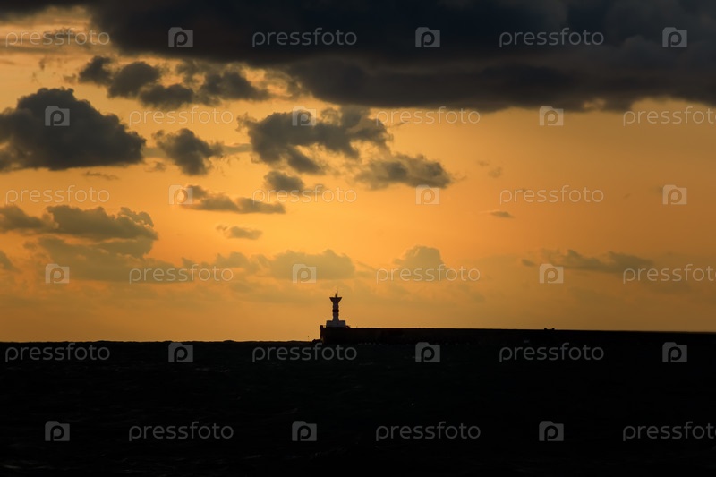 Маяк силуэт темного неба на закате. Контрастный вечерний морской пейзаж