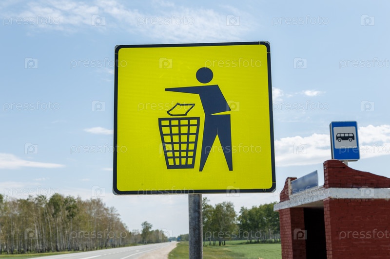 Желтый знак на автобусной остановке. Не мусорить