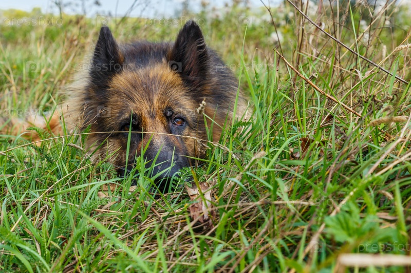 Немецкая овчарка лежит в траве. Грустная собака смотрит в камеру