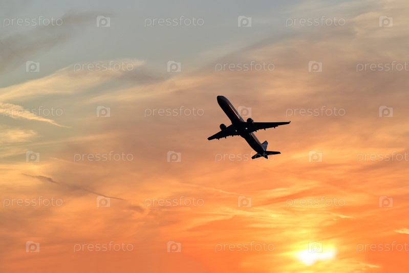 Пассажирский реактивный самолет летит над облаками на закате. Красивые пейзажи заката, транспорт и концепция быстрого путешествия