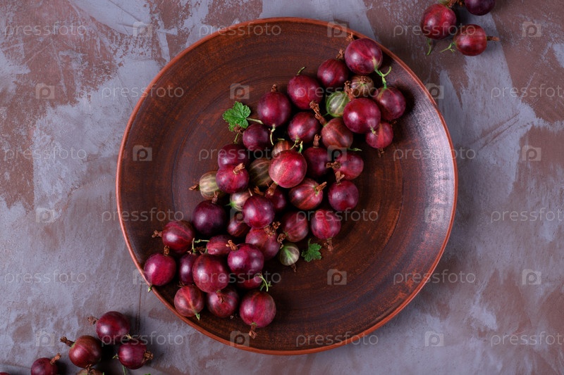 Красный крыжовник на глиняной тарелке. Вид сверху. Сбор ягод