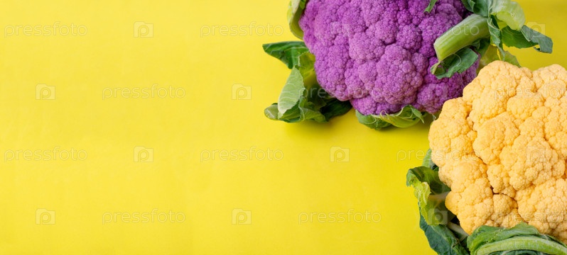 Веб-баннер с желтой и фиолетовой цветной капустой на желтом фоне . Красочный овощ