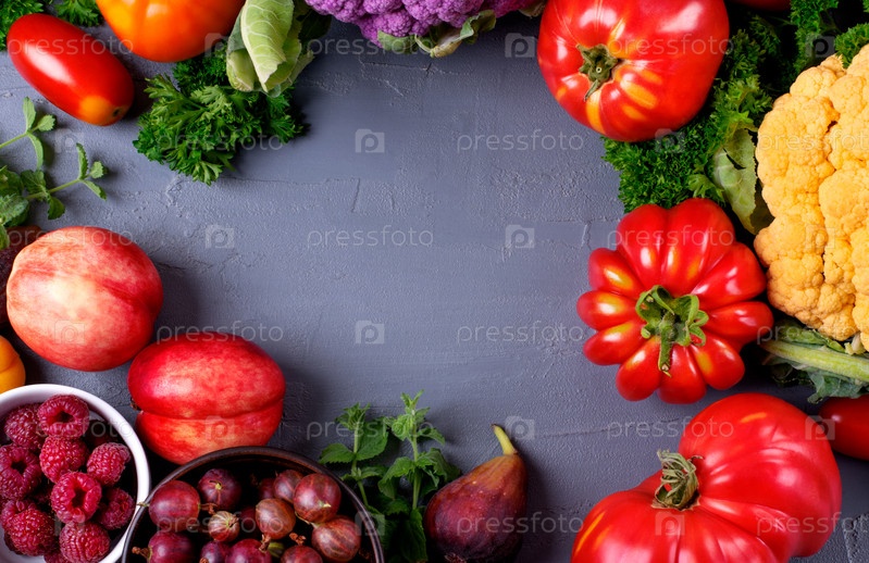 Макет с вариацией урожая овощей с ассорти помидоров и фиолетовой и желтой цветной капустой в составе сезонных продуктов. Копировать пространство