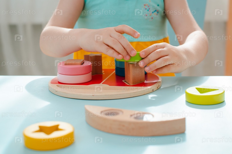 Маленькая девочка собирает деревянный разноцветный сортер Безопасные детские игрушки из натурального дерева