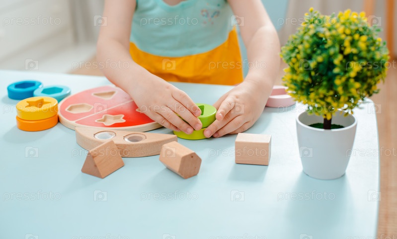 Маленькая девочка собирает деревянный разноцветный сортировщик Безопасные детские игрушки из натурального дерева Развивающая игра