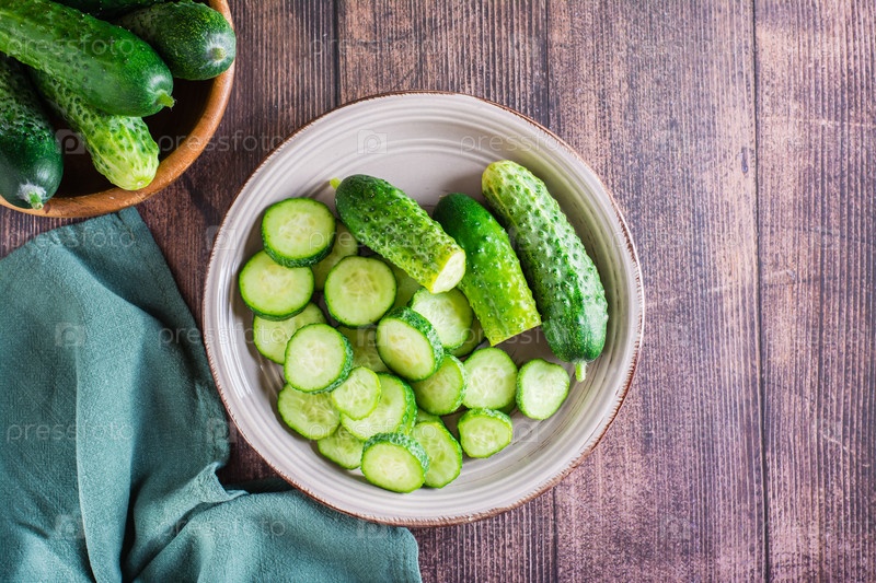 Спелые нарезанные огурцы на тарелке на столе. Органическое диетическое питание. Вид сверху