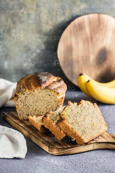 Нарезанный банановый хлеб на разделочной доске на столе. Модный десерт. Вертикальный вид