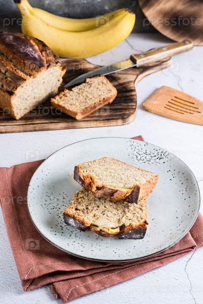 Нарезанный банановый хлеб на тарелке на столе. Домашний модный завтрак. Вертикальный вид