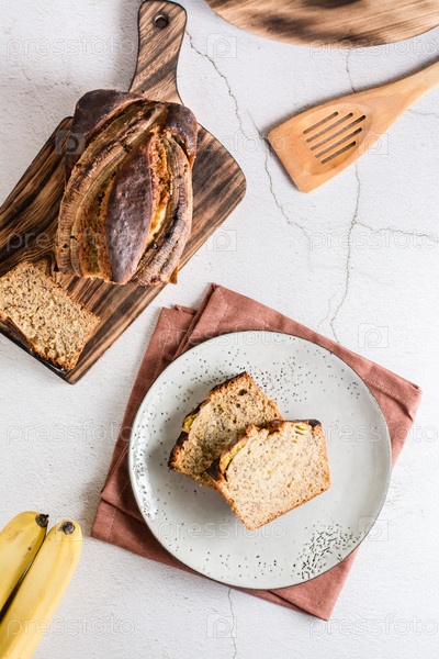Нарезанный банановый хлеб на тарелке на столе. Домашний модный завтрак. Верхний и вертикальный вид