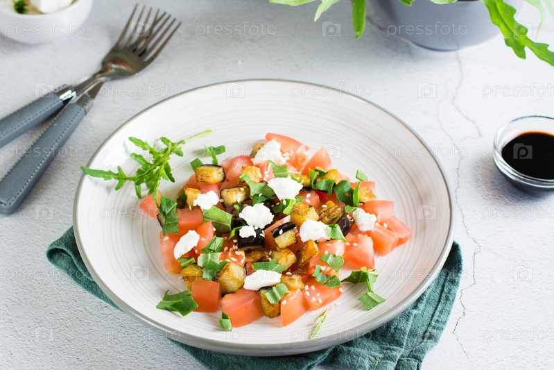 Салат из жареных баклажанов, помидоров, рикотты и рукколы на тарелке на столе. Домашний обед