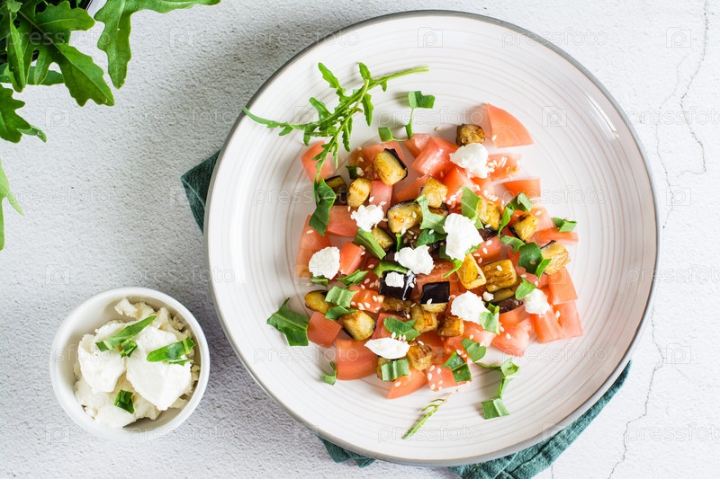 Салат из жареных баклажанов, помидоров и сыра фета на тарелке. Домашний обед. Вид сверху. Крупный план