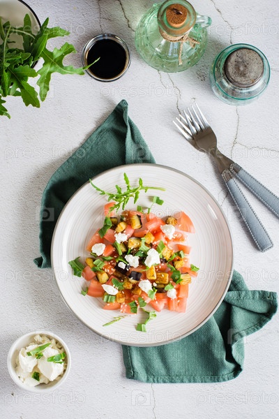 Салат из жареных баклажанов, помидоров, рикотты и рукколы. Домашний обед. Верхний и вертикальный вид