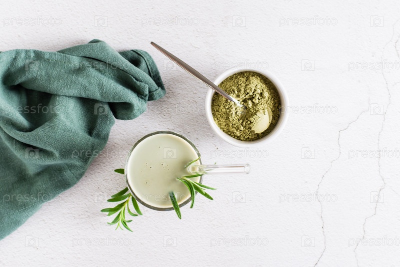 Матча латте в стакане и порошок в миске на столе. Домашний модный напиток. Вид сверху