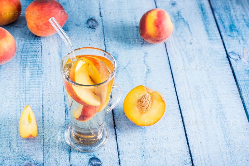 Компот из свежих персиков в стакане с соломинкой на столе. Летние органические напитки