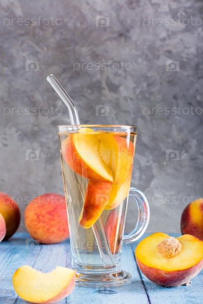 Персиковый компот в стакане с соломинкой и фруктами на столе. Летние органические напитки. Вертикальный вид