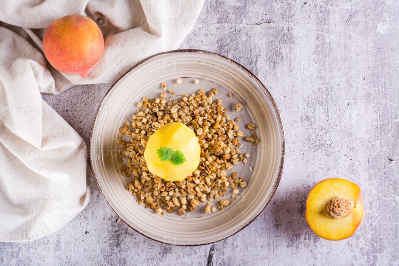 Корейский модный завтрак греческий момо на тарелке на столе. Домашнее угощение. Вид сверху